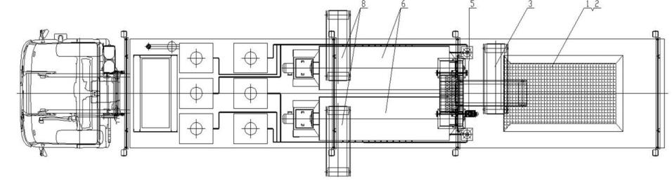 圖中:1、篩選機,2、破碎機,3、傳送帶,4、傾角輸送帶,5、雙道給料系統,6、攪拌離心機模塊,7、管路,8、可折疊式水平輸送帶,9、車載化學處理系統,10、車載輸送系統,11、監控系統,12、車載配電系統,13、車箱,14、運輸車。